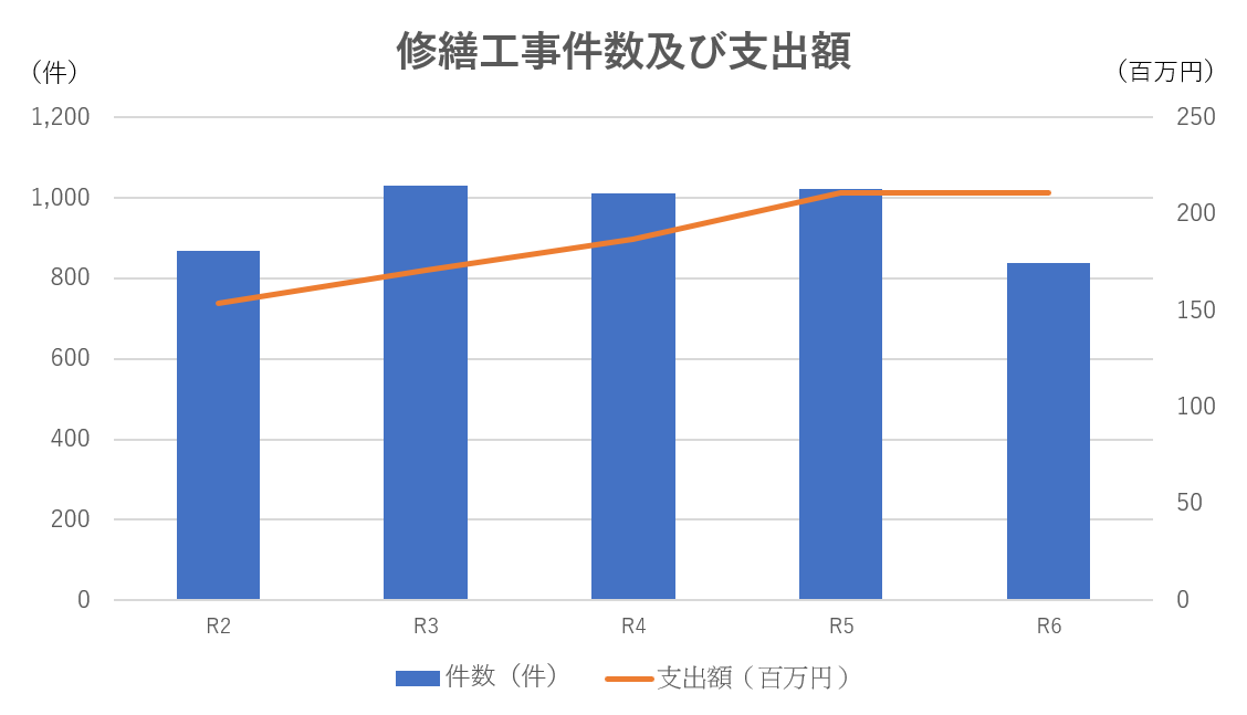 A3:管路の修繕については、令和3年度以降は件数が約1,000件前後で金額は2億数千万円を推移しています。