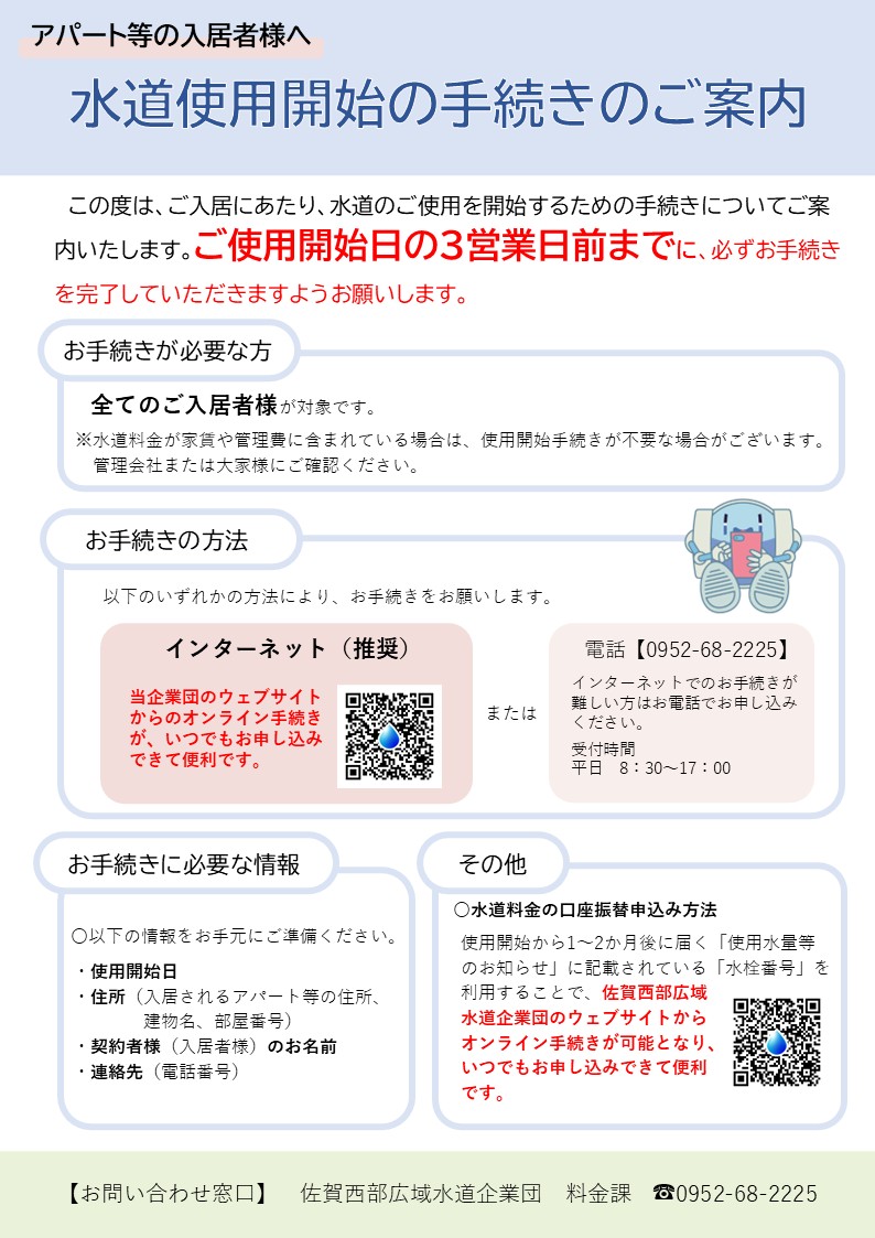 この度、佐賀西部広域水道企業団管内のアパート等に入居される方がスムーズに水道の使用を開始できるように、『水道使用開始の手続きのご案内チラシ』を作成しました。