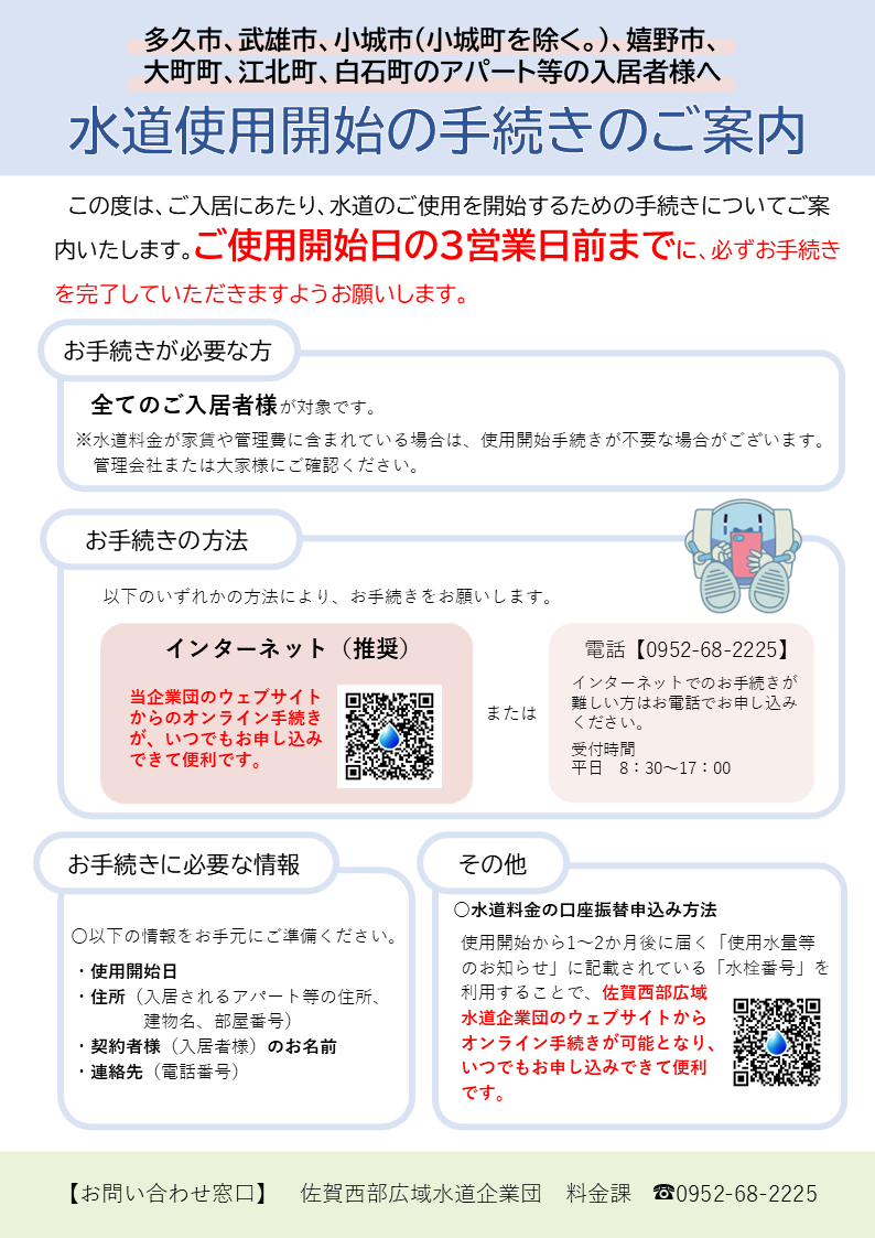 この度、佐賀西部広域水道企業団管内のアパート等に入居される方がスムーズに水道の使用を開始できるように、『水道使用開始の手続きのご案内チラシ』を作成しました。